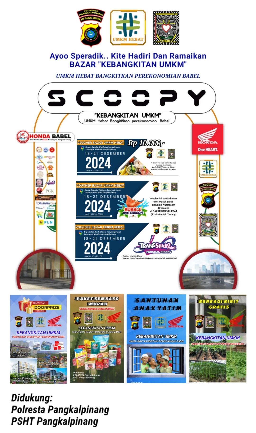 Tjakramedia.com, Pangkalpinang – Hadiri dan ramaikan Bazar Kebangkitan UMKM, yang akan di selenggarakan mulai tanggal 18-21 Desember 2024, jam 16.00 sd 22.00, Bertempat di Lapangan Merdeka Pangkalpinang.